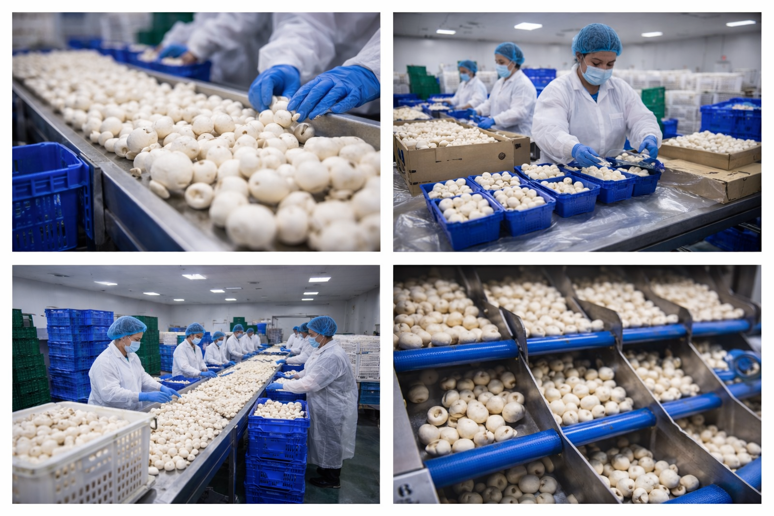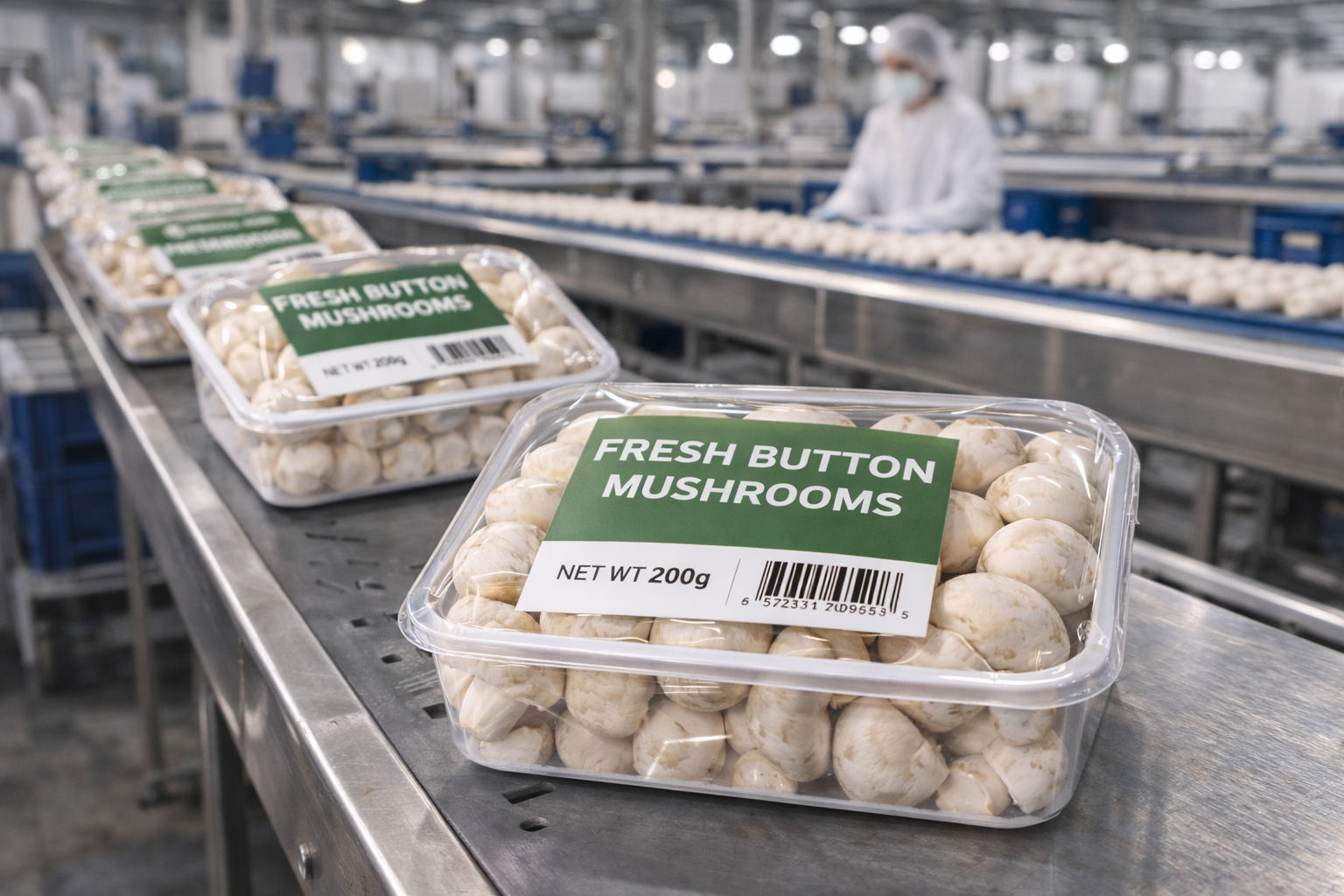 Premium white button mushrooms grown under hygienic, controlled environmental conditions.